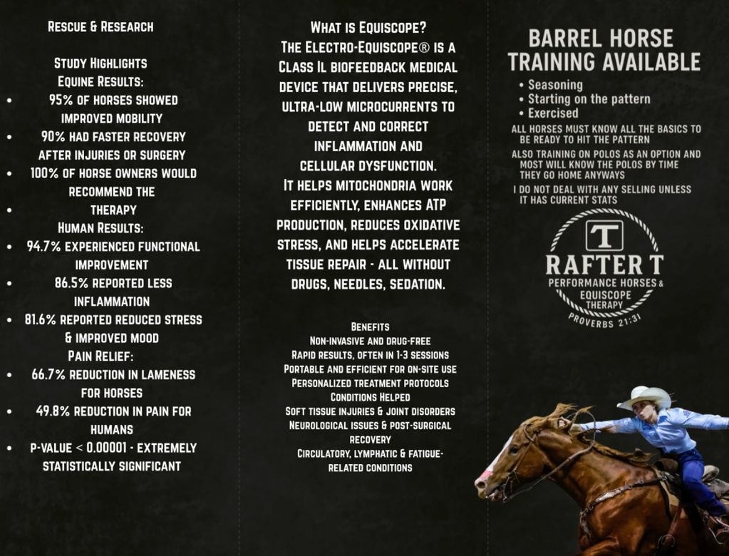 At Rafter T equiscope Therapy, I am dedicated to providing compassionate and personalized services. I take pride in helping horses, people, and pets feel their best!